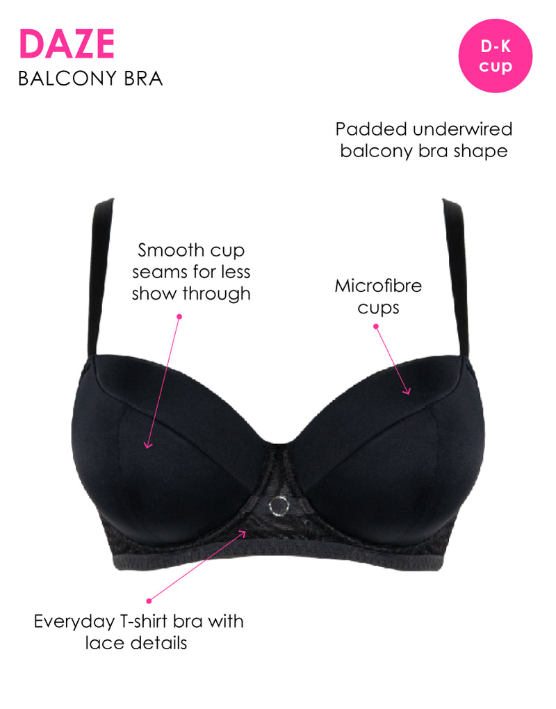 Welcome to our brand new Curvy Kate Daze t-shirt balcony bra. Sitting alongside the Lace Daze range, this effortless and easy to wear and will be your new favourite. Soft foam lined cups and flat seams in smooth microfibre give a sleek fit under clothes, trimmed with the same lace at the cradle as the Lace Daze range for a pretty finish. Designed with big boobs in mind offering fantastic shape and support through to a K cup!