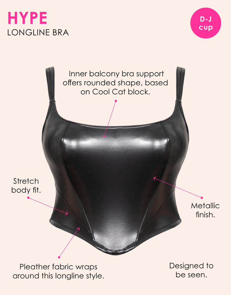 Dare to be bold in our gorgeous Hype longline corset balcony bra. Gunmetal pleather fabric offers the ultimate worn to be seen piece perfect for festivals and party season, whilst the inner balcony bra offers support and comfort to have you dancing all night long!