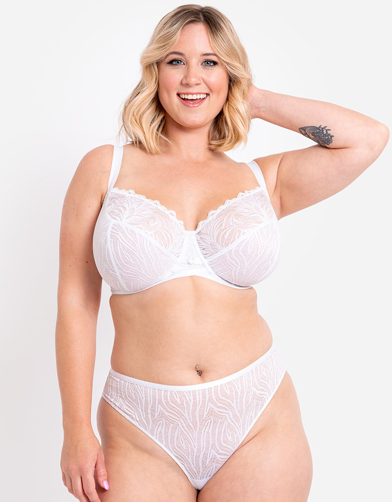 Our Lace Daze brazilian brief is made in stretch zebra-effect lace with flattering scalloped detailing. In a crisp white, this sits just above the hip for beautiful shape and amazing comfort!