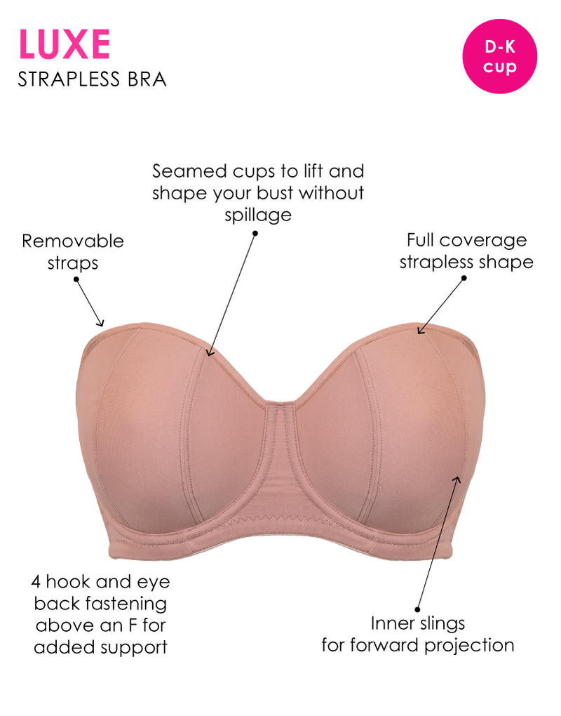 Our best-selling Luxe strapless has had a makeover and this season, less is more. No pinstripes or bows, just the best supporting seamed cups that offer incredible uplift, rounded shape and support, proving it is the best strapless bra for big boobs! The 4 hook and eye fastening back band hugs your curves without the worry of slipping. The 'Best Supporting Act' really does go to... our Luxe Strapless Bra!