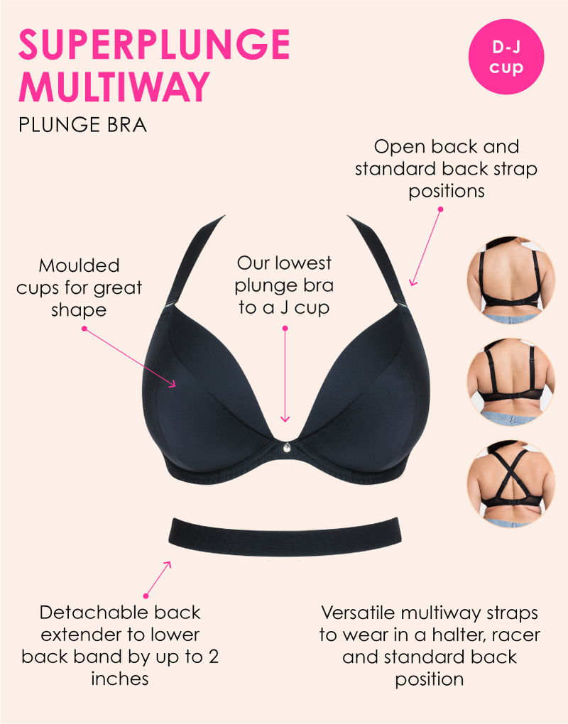 Our SuperPlunge Multiway Bra turns outfit goals into reality thanks to our multi-way straps that can be worn in a multitude of ways, and low back extender to wear under those backless outfits! Clever, soft foam lining in the cups pushes the breasts in, up and forward creating a killer cleavage while still offering a secure fit with a firm lift. The SuperPlunge Multiway Bra is a must have for your wardrobe in Black, so that you can wear this seasons trends without compromising on support.